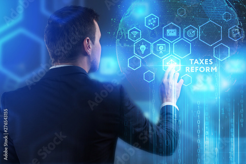 The concept of business, technology, the Internet and the network. A young entrepreneur working on a virtual screen of the future and sees the inscription: taxes reform