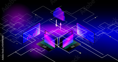 The concept of cloud technology work together with technology to help send and receive information through maximum efficiency,Vector illustration fantastic style,Cloud technology concept