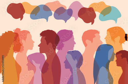 The concept of communicating and talking in a multiethnic community. Digital sharing. Coloured clouds. Multiethnic people in a speech bubble. The concept of communication in social networks.