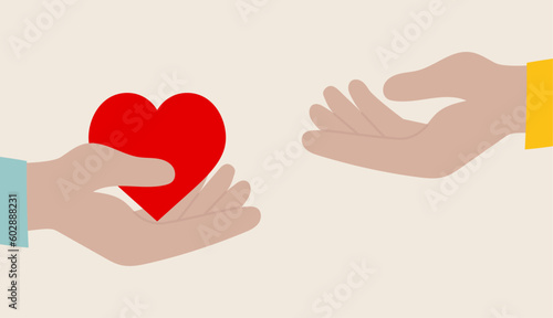 The concept of help and empathy. Hand-drawn flat illustration with a heart in hand. A volunteer or friend gives support to a person in need. A symbol of kindness, compassion, charity.