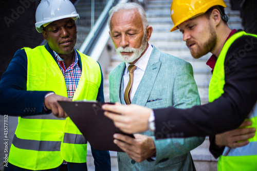 The construction site boss has a conversation with the architects. Focus is on background. Holding document.
