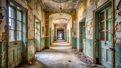 The corridor of an old, abandoned hospital, with its shabby walls and doors, represents the architecture of an aged and forgotten building, ideal for your design.