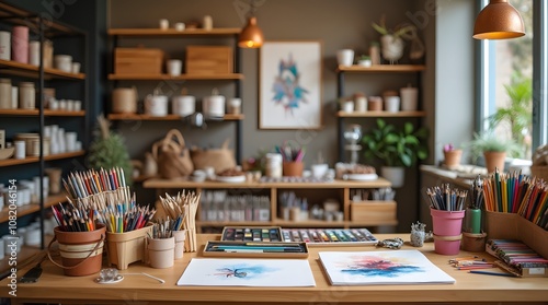 The counter of an art store, on the shelves there are watercolors, colored pencils, felt-tip pens and sketchbooks. Art store.