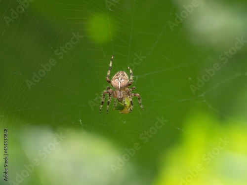 The crusader spider eats a treehopper caught in its spider web. Super macro video of a spider insect. Natural habitat conditions. Blurred green background.