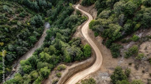 The curvy dirt path snakes through vibrant greenery, forming organic patterns in the rural terrain.