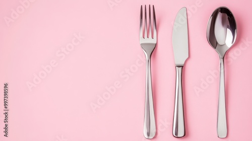 The cutlery set includes a fork, knife, and spoon crafted from shiny stainless steel, displayed neatly on a soft pink background in a topdown arrangement