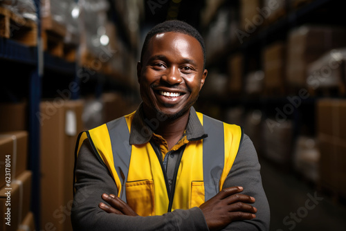 The delivery man standing arms crossed in the warehouse
