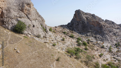 The desert surface of the sacred mountain of the city of Osh Sulaiman-Too. View of the amazing mountains.