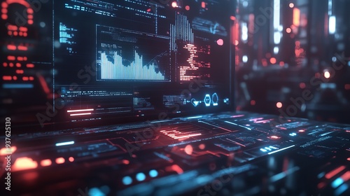 The detailed digital interface is superimposed on a cityscape with purple and blue high-rises. Dynamic elements such as graphs and charts in orange and blue hint at data exchange or city management,