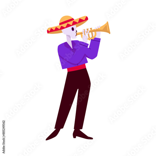 The Dia de Muertos is captured in a colorful vector illustration with a cheerful skeleton musician