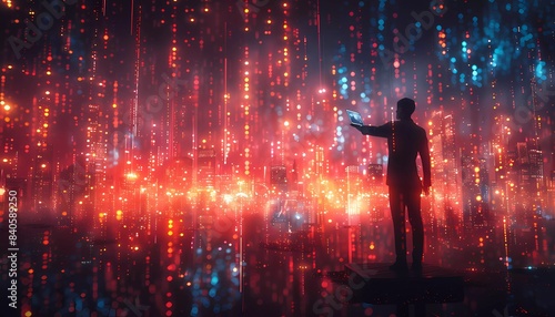 The Digital Maestro: Conducting a Symphony of Numbers, businessman standing on a digital stage, leading an orchestra of numerical data to audit and evaluate corporate financial statements,