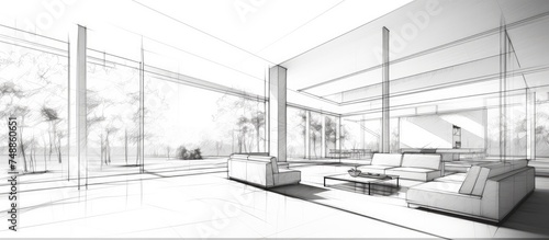 The drawing depicts a modern living room with minimalist design, featuring sleek couches and stylish tables. Large windows allow natural light to fill the room, creating a bright and airy atmosphere.