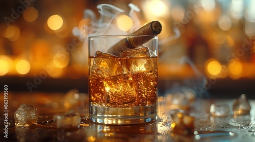 The drink of whiskey or cognac with ice cubes and the smoking of cigars