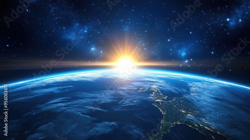 The Earth seen from space with a serene blue sunrise, casting light on the oceans and continents below.