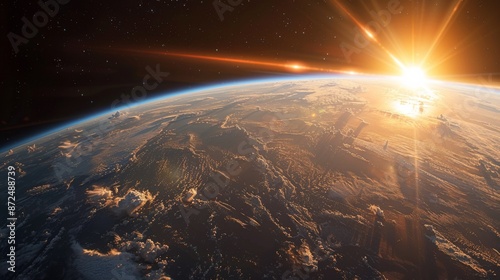 The Earth seen from space with the sun in the background, capturing an astronaut's view from orbit. Stunning depiction of our planet and the solar phenomena from the depths of space