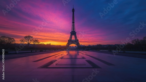The Eiffel Tower at dusk, with the sky transitioning from day to night, capturing the magic of the moment -