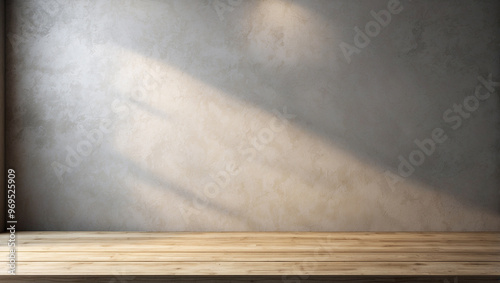 The empty wooden table top with window shadow on concrete wall texture background. For product display