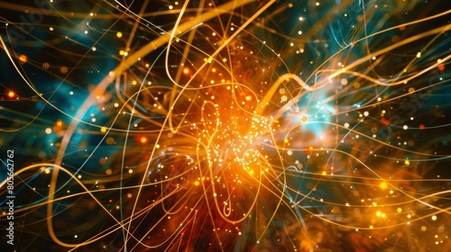The energy lines between the quarks are shown as constantly shifting and changing representing the everchanging nature of the subatomic world.