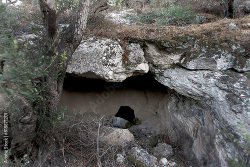 The entrance to an ancient Roman cave with an olive tree in front of it in a mountainous area north of the village