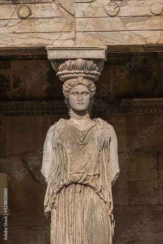 The Erechtheion (or Erechtheum, 406 BC) with Caryatids - ancient Greek temple on the north side of the Acropolis. Erechtheion dedicated to both Athena and Poseidon. Athens, Greece.
