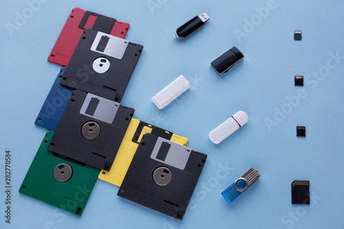 The evolution of digital data storage device. Floppy disks, flash drives and small memory cards.