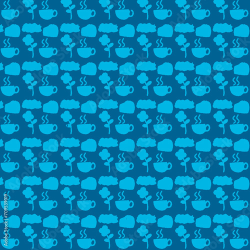 The fabric pattern in blue tones has endless images of coffee cups, flowers, cakes, clouds in a cute light blue color
