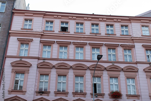 The facade of a historic pink building stands out, showcasing its windows in a busy urban setting