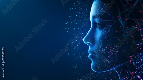 The face of artificial intelligence with blue light and green lines in the background, in the style of futuristic contraptions, uhd image, textural portraits, mind-bending murals, depth of field, long