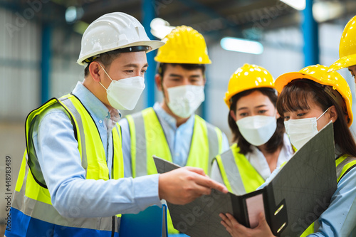 The factory employee consists of engineers, foreman, technicians, and related department staff. Wear a mask, hard hat, and vest. meeting before starting work inside the warehouse. Teamwork concept.