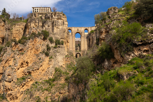 The famous bridge with arched vaults between the rocks of the gorge on a sunny day. Landmark of the city of Ronda, Andalusia, Spain