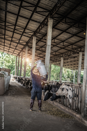 The farmer is working on an organic farm with a dairy cow and holding a large milk container. The model is a real farm worker!
