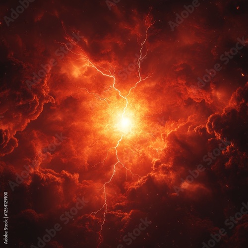 The fiery skies are lit up by a robust lightning storm, showcasing stunning, glowing cloud patterns.