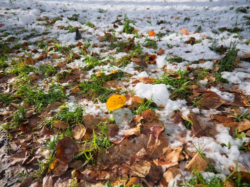 The first snow on a green lawn covered with colorful autumn fallen leaves close-up.