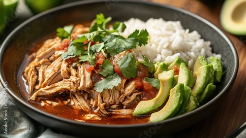 The flavorful chicken, paired with tender rice and fresh avocado, is beautifully plated on a table, highlighting its vibrant and hearty presentation.