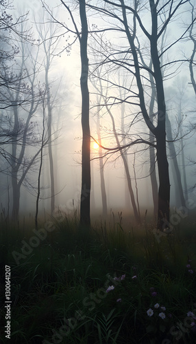 The forest during the fog. Soft light during sunrise. Blooming trees and grasses with flowers. Mystical atmosphere. Image for background and wallpaper, dreamy atmosphere. with white shades