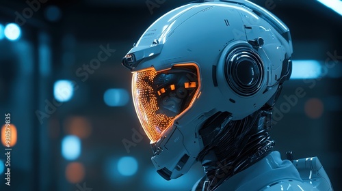 The futuristic helmet exhibits glowing elements and intricate details, reflecting advanced technology against a dark, illuminated backdrop