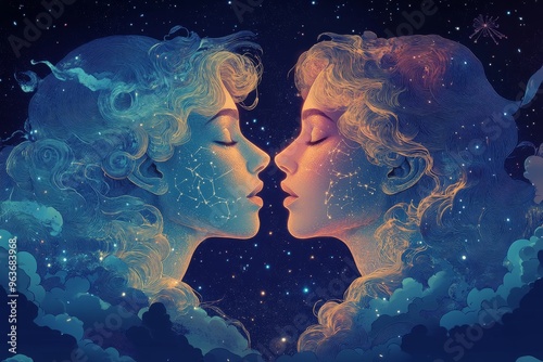 The Gemini zodiac symbol with two symmetrical, intertwined figures representing twins. Generative AI