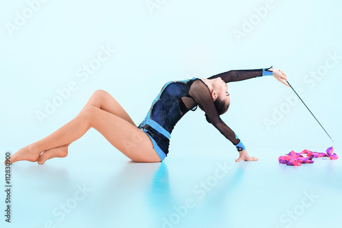 The girl doing gymnastics dance with colored ribbon on a blue background