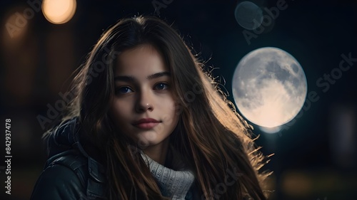 the girl with middle long hair,street,under the lamp,moon,hug hardly Generative AI