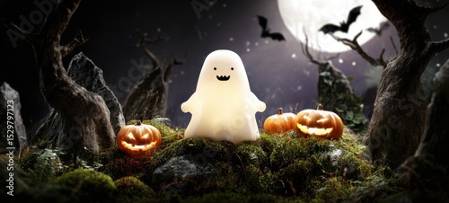 The glowing ghost surrounded by pumpkins in a spooky Halloween setting.