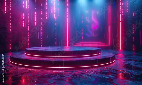 The glowing neon futuristic podium with illuminated holographic display, set against a digital data stream background, provides the perfect showcase for innovative and tech-savvy products.
