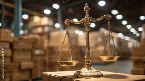 The golden scales of justice in a busy warehouse environment