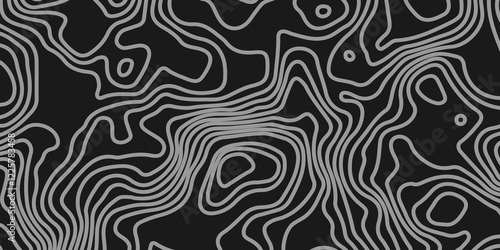The grey white on black contours vector topography stylized height of the lines. The concept of a conditional geography scheme and the terrain path. Ultra wide. Map vector terrain Illustration.