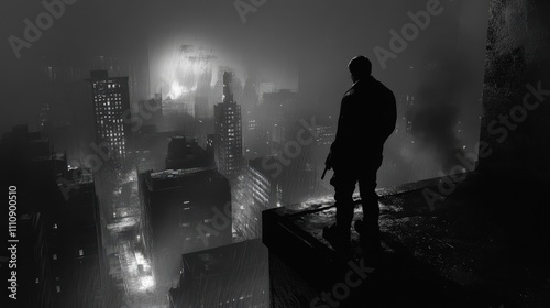 The gunman surveys the area from a high vantage point. His senses are sharpened as he watches for any signs of movement.