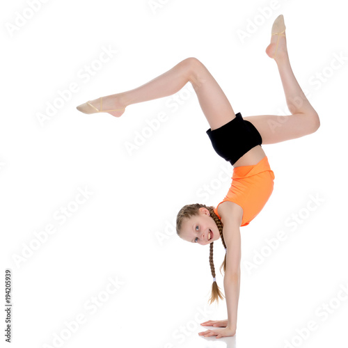 The gymnast performs a handstand with bent legs.