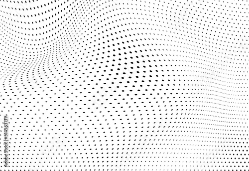 The halftone texture is chaotic monochrome. Abstract black and white waves background of dots. Backdrop for the design of websites, business cards, posters