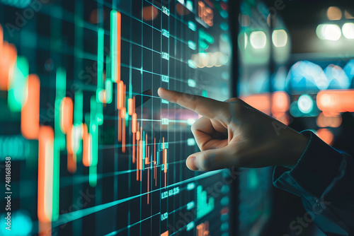 The hand of a businessman or investor or trader pointing at a computer screen, screen with stock market chart analysis or research information for trading and investing