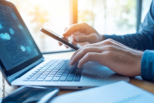 The hands of a businessman are working on a laptop computer keyboard on a wooden table as he types