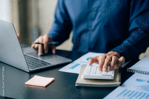 The hands of a male businessman are analyzing and calculating the annual income and expenses in a financial graph that shows results To summarize balances overall in office