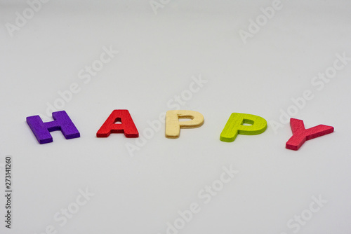 The HAPPY text from colorful wooden letters is on white background, learning alphabet, Sensitive focus.